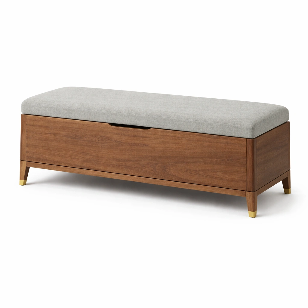 Panca contenitore in legno rovere con seduta in tessuto grigio e base in metallo nero